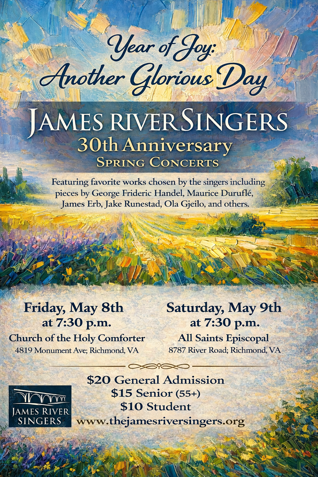 James River Singers is celebrating our 30th Anniversary. We are thrilled that we have been a part of the Richmond community for 30 years and we hope you will join us for a year of tremendous and celebratory music!